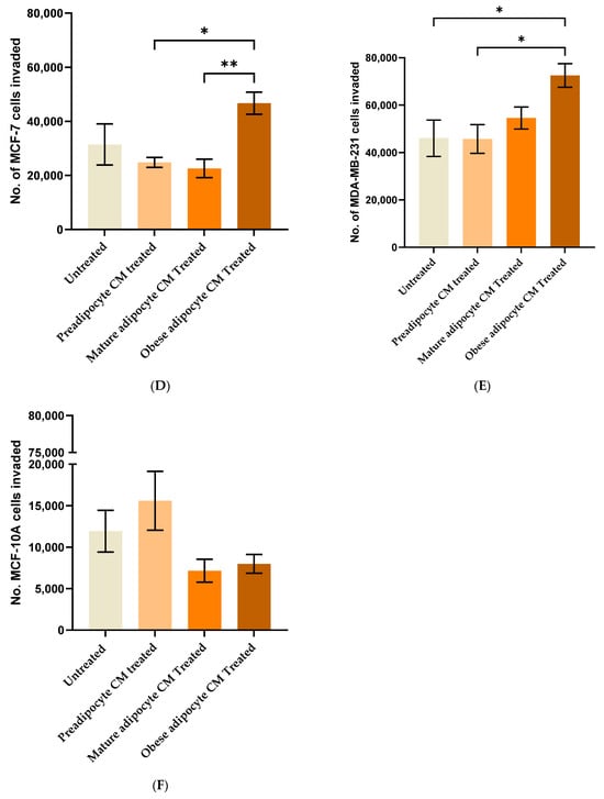 2.2. Exposure to the In Vitro Fat Cell-Derived Conditioned Medium Mimicking Obesity Increased the Invasive Potential of Breast Cells