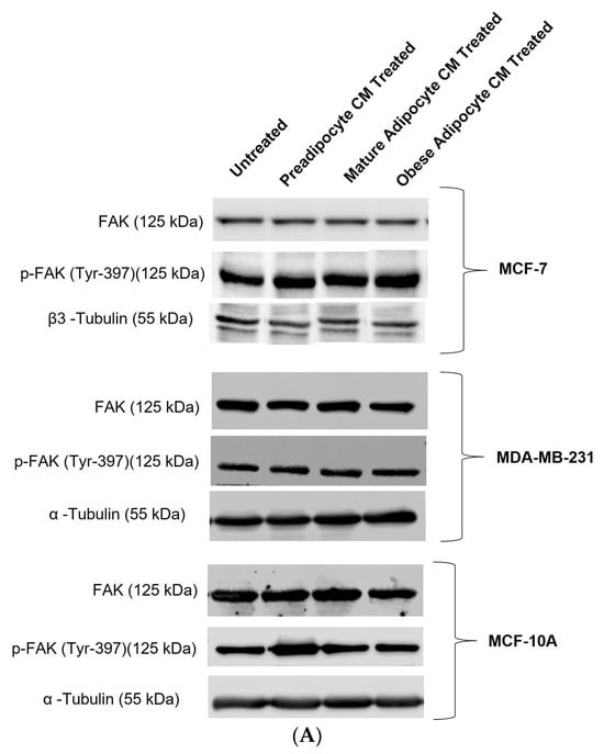 To address the potential relationship of adipocyte-secreted factors towards activating FAK and its downstream effector proteins, non-tumorigenic breast cells (MCF-10A) and breast cancer cells with low (MCF7) and high (MDA-MB-231) metastatic potential were exposed to in vitro murine adipocyte-derived, conditioned medium (CM). For the in vitro adipocyte model, 3T3-L1 MBX cells differentiated to obesity with fatty acids supplementation were used []. Murine 3T3-L1 MBX fibroblasts exhibited a pre-adipocyte form (fibroblast), a differentiated form (mature adipocytes), and with addition of fatty acid supplementation, an obese form []. These forms were used to create separate control in in vitro conditioned medium treatment environments []. The conditioned medium containing adipocyte-secreted factors were explored using a proteome profiler mouse adipokine array kit as previously described []. The media containing secreted factors from these different forms of adipocytes were used as conditioned media derived from in vitro fat cells in this current study [].