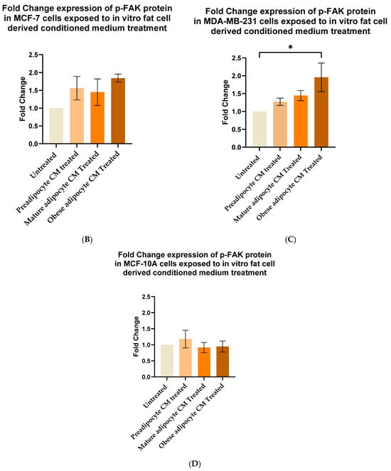 Extracellular signaling molecules such as growth factors, cytokines, etc., control FAK activation through autophosphorylation at Tyr397 []. With the changes in the secretion pattern of adipocytes, we investigated whether there were any changes in the post-translation modification status of FAK protein through its autophosphorylation at Tyr397. Figure 3A shows representative immunoblotting results of phosphorylated p-FAK (Tyr397), total FAK, α-tubulin, and β3 tubulin protein levels in breast cells, exposed to in vitro fat cell-derived conditioned media. When MCF7 cells were exposed to in vitro fat cell-derived adipocyte-secreted factors, an upward trend of autophosphorylation of FAK protein was observed under obese conditions (Figure 3B). With the same exposure conditions, MDA-MB-231 cells showed a significant increase in the fold change expression of p-FAK protein at Tyr-397 with respect to the untreated MDA-MB-231 (Figure 3C). For non-tumorigenic MCF-10A cells, no change in the phosphorylation status of FAK was observed when they were exposed to in vitro mature and obese adipocyte-derived conditioned medium (Figure 3D). However, for the pre-adipocyte-derived conditioned medium, MCF-10A cells showed an upward trend of phosphorylation status of FAK protein in comparison to the untreated (Figure 3D).