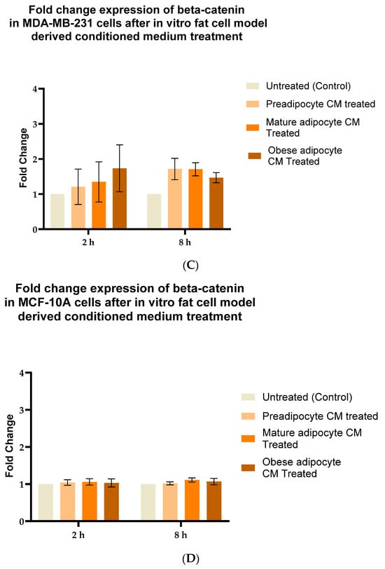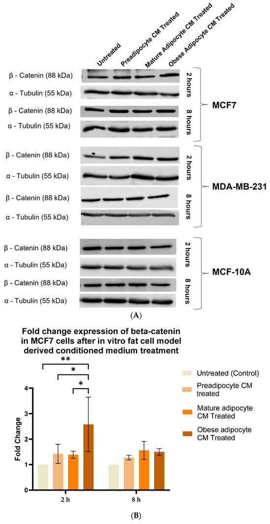 Aberrant expression of beta-catenin, an essential intermediate in the Wnt signaling pathway, has been reported for many malignancies [,]. β-catenin protein was found to be stabilized downstream to the FAK protein-activated cell signaling pathway [,]. Hence, in this study, we investigated whether, with the changes in the secretion pattern of adipocytes, there were any changes in the stabilization for β-catenin protein. For that purpose, we exposed MCF-7, MDA-MB-231 and MCF-10A cells to the varied phases of adipocyte-derived conditioned media for 2 and 8 h. We then analyzed the changes in expression of beta-catenin in the whole cell lysate of MCF-7, MDA-MB-231, and MCF-10A with respect to their treatment by Western blotting. Figure 4A is a representative blotting image of beta-catenin and α-tubulin protein expressed in breast cells exposed to in vitro fat cell-derived conditioned medium. The data showed that MCF7 cells (Figure 4B), exposed to in vitro adipocyte-derived conditioned medium mimicking obesity, had significant elevation in β-catenin stabilization after 2 h, compared to untreated. β-catenin stabilization continued to remain elevated over the 8 h exposure of in vitro adipocyte-derived conditioned medium mimicking obesity. However, this intensity was much less than the expression found at 2 h of exposure under the same conditions. For MDA-MB-231 cells (Figure 4C), the elevation in β-catenin stabilization in cells exposed to in vitro adipocyte-derived conditioned medium mimicking obesity is not significant, but the trend is upward, both for short and long exposure times. Importantly, no changes in the stabilization of β-catenin were observed for non-tumorigenic MCF-10A cells (Figure 4D) exposed to any of the in vitro adipocyte-derived conditioned media irrespective of adipogenic changes or conditions mimicking obesity.