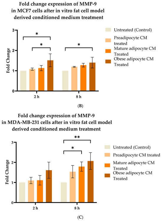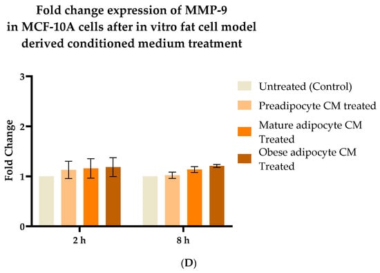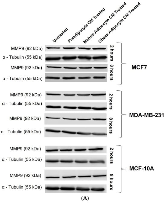 Studies have shown increased expression of MMP-9 protein with respect to the presence of several endocrine factors [,,,,,,]. Hence, in this study, we investigated whether the changes in the secretion pattern of adipocytes (specifically under conditions mimicking obesity) caused changes in the expression of MMP-9. To address this, MCF7, MDA-MB-231, and MCF-10A were exposed to various adipocyte-derived conditioned media for 2 and 8 h. Following this, changes in expression of MMP-9 in the whole cell lysate of MCF7, MDA-MB-231, and MCF-10A with respect to their exposure conditions of adipocytes were analyzed by Western blotting. Figure 5A shows a representative blotting image of MMP-9 and α-tubulin protein expressed in breast cells exposed to in vitro fat cell-derived conditioned medium. The data indicate constant, significant elevation of MMP9 expression in MCF7 (Figure 5B) and MDA-MDB-231 (Figure 5C) cells both for 2 and 8 h exposure to the adipocyte-secreted factors mimicking obesity, in comparison to untreated. The elevation in MMP-9 expression was also significantly elevated in MDA-MB-231 cells exposed to in vitro mature adipocyte-derived condition medium for 8 h. However, no changes in the expression of MMP9 were observed for non-tumorigenic MCF-10A cells (Figure 5D) exposed to any of the in vitro adipocyte-derived conditioned media, irrespective of adipogenic changes or conditions mimicking obesity.
