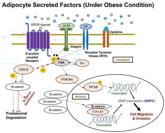 The proposed activation of FAK-mediated metastatic signal transduction pathway implicated in breast cancer cells in response to aberrant adipokine secretion under in vitro conditions mimicking obesity. FAK is activated through phosphorylation when extracellular stimuli in the microenvironment interact with integrin, receptor tyrosine kinase, and G-protein coupled receptors. This study has observed the aberrant secretion of adipokines under conditions mimicking obesity causing greater activation of FAK through its autophosphorylation at Tyr397 residue. Upon FAK activation, FAK-Src complexes will activate several downstream targets via phosphorylation. Activated FAK will cause proteasomal degradation of GSK3β through its phosphorylation, and for that reason, this study has observed an increased presence of β-catenin protein in breast cancer cells under in vitro conditions mimicking obesity. Stabilized β-catenin will then translocate to the nucleus and transcriptionally regulate the expression of several proteins associated with survival and metastatic events in breast cancer cells. This study has also observed enhanced expression of MMP-9 protein in breast cancer cells under in vitro conditions mimicking obesity, downstream to p-FAK through the PI3K/Akt/NF-kB signaling axis.