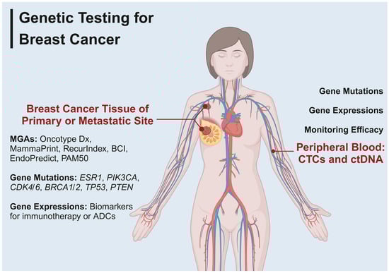 Multigene assays (MGAs) and genetic testing for specific genes have been developed for patients with breast cancer (Figure 1). Selecting appropriate genetic testing based on the clinicopathological features of patients and comprehensively managing therapeutic regimens are gradually being promoted. This review illustrated representative oncogenic mutations and aberrant expressions of certain genes that reflect clinical outcomes, therapeutic effects, and malignant biological properties. For HR-positive breast cancer patients in the early stage, MGA including Oncotype Dx, MammaPrint, RecurIndex, breast cancer index (BCI), EndoPredict, and Prosigna Prediction Analysis of Microarray 50 (PAM50) are all helpful candidates for precisely predicting clinical outcomes [,,,,,,]. For patients with metastatic breast cancer, genetic tests that include specific genetic mutations and biomarkers for immunotherapy also help to identify therapeutic targets and monitor efficacy [,,]. In this review, different genetic tests for breast cancer are reviewed, as well as their advantages and limitations.