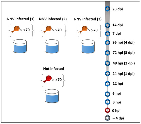 An experimental NNV challenge via intramuscular injection was utilized to study NNV infection progress in 28 days post infection period. A summary of the experimental setup is given in Figure 1.