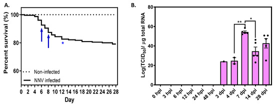 (A) Cumulative survival of NNV-challenged (continuous line) and non-infected (dashed line) fish groups. The mean mortality is represented in each time point (days post infection). The arrows indicate the time points with the highest daily mortalities. One asterisk indicates p < 0.1. (B) Absolute RNA1 quantification in the brain from European sea bass challenged with NNV. Results are mean ± SEM (n = 5). Each dot represents a biological sample. Significant differences were analyzed using a one-way ANOVA test with Bonferroni’s multiple comparison test correction. One asterisk indicates p < 0.05, two asterisks indicate p < 0.01.