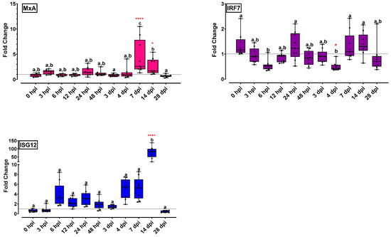 Interferon pathway-related gene expression (MxA, IRF7, ISG12) levels for the head kidney of NNV-challenged and non-challenged groups are given as bounds of box and whisker plots with min-to-max values. The line represents the median (n = 9 fish per group), the whiskers show the data range, and the box shows the interquartile range. Each dot represents a biological sample. All statistical differences were assessed with ordinary two-way ANOVA followed by Tukey’s multiple comparison test. Statistically important differences between challenged and non-challenged groups are denoted with red asterisks (*: p < 0.05, ****: p < 0.0001). Different lower-case letters denote statistically significant differences between sampling time points for the NNV challenged group.