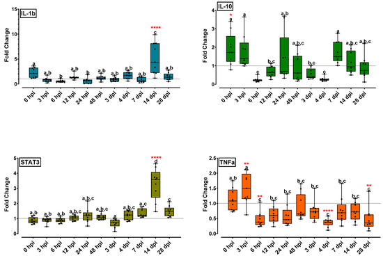 Cytokine-related gene expression (IL-1b, IL-10, STAT3, TNFa) levels for the head kidney of NNV-challenged and non-challenged groups are given as bounds of box and whisker plots with min-to-max values. The line represents the median (n = 9 fish per group), the whiskers show the data range, and the box shows the interquartile range. Each dot represents a biological sample. All statistical differences were assessed with ordinary two-way ANOVA followed by Tukey’s multiple comparison test. Statistically important differences between challenged and non-challenged groups are denoted with red asterisks (*: p < 0.05, **: p < 0.01, **** indicate p < 0.0001). Different lower-case letters denote statistically significant differences between sampling time points for the NNV challenged group.