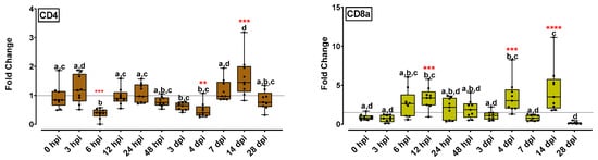 T-cell marker-related gene expression (CD4, CD8a) levels for the head kidney of NNV-challenged and non-challenged groups are given as bounds of box and whisker plots with min-to-max values. The line represents the median (n = 9 fish per group), the whiskers show the data range, and the box shows the interquartile range. Each dot represents a biological sample. All statistical differences were assessed with ordinary two-way ANOVA followed by Tukey’s multiple comparison test. Statistically important differences between challenged and non-challenged groups are denoted with red asterisks (**: p < 0.01, ***: p < 0.001, ****: p < 0.0001). Different lower-case letters denote statistically significant differences between sampling time points for the NNV = challenged group.