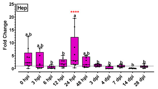 Hepcidin (Hep) expression levels were increased at the initial time point (0 hpi) and slightly decreased on very early points (3–6 hpi). Hep expression reached a maximum on 24 hpi (6.5-fold), gradually decreased at the following time points and remained low until the end of experimentation (Figure 6).