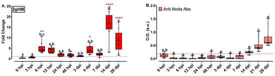 (A) Immunoglobulin gene expression (IgHM) levels for the head kidney of NNV-challenged and non-challenged groups are given as bounds of box and whisker plots with min-to-max values. The line represents the median (n = 9 fish per group), the whiskers show the data range, and the box shows the interquartile range. Each dot represents a biological sample. (B) Specific anti-nodavirus antibody O.D. levels for the NNV-challenged group are given as bounds of box and whisker plots with min-to-max values. The line represents the median (n = 15 fish per group), the whiskers show the data range, and the box shows the interquartile range. All statistical differences were assessed with ordinary two-way ANOVA followed by Tukey’s multiple comparison test. Statistically important differences between challenged and non-challenged groups are denoted with red asterisks (*: p < 0.05, **: p < 0.05, ****: p < 0.0001). Different lower-case letters denote statistically significant differences between sampling time points for the NNV challenged group.