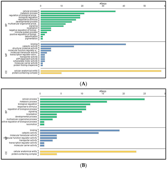 When functionally analyzed using OmicsBox software (version 3.0.30), a total of 124 up-regulated and 48 down-regulated genes could be blasted, GO mapped and annotated from the differentially expressed transcripts on Day 14. The up-regulated and down-regulated genes were classified according to the GO database into the categories of biological process, molecular function and cellular component. For the up-regulated genes (Figure 9A), “cellular process” (36 genes) was the largest subcategory in the category of biological process, followed by “metabolic process” (21 genes). The major subcategory for molecular function was “binding” (41 genes) followed by “catalytic activity” (16 genes). The “cellular anatomical entity” (58 genes) was the major GO term in the cellular component category. For the down-regulated genes (Figure 9B), “cellular process” (25 genes) was the largest subcategory in the category of biological process, followed by “metabolic process” (16 genes). The major subcategory for molecular function was “binding” (19 genes) followed by “catalytic activity” (14 genes). The “cellular anatomical entity” (23 genes) was the major GO term in the cellular component category.