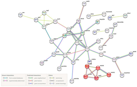 Protein–protein interaction (PPI) networks for the differentially expressed proteins found 14 days following NNV infection in D. labrax head kidney. This was retrieved via API access to the STRING database (https://string-db.org) (accessed on 23 February 2023) and was performed based on the Danio rerio protein database. Each node represents a differentially expressed protein. Red nodes represent the significantly enriched KEGG pathway oxidative phosphorylation. The edges represent protein–protein interactions, and the nature of the protein–protein interactions are color-coded, as indicated in the figure.