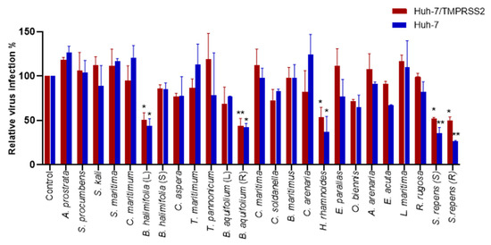 Screening of the antiviral activity of crude methanolic extracts on HCoV-229E-Luc. Huh-7 or Huh-7/TMPRSS2 cells were inoculated with HCoV-229E-Luc in the presence of various plant extracts at 25 µg/mL. Cells were lysed 7 h post-inoculation, and luciferase activity was quantified. Experiments were performed in triplicate, with each experiment being repeated thrice. The data bars represent the mean ± SEM. The asterisk indicates a statistical difference compared to the control (*, p < 0.05; **, p < 0.01).
