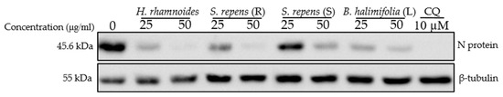 Antiviral activity on SARS-CoV-2 of crude methanolic extract of Hippophae rhamnoides, Salix repens (R), Salix repens (S), and Baccharis halimifolia (L). Vero-81 cells were infected with SARS-CoV-2 in the presence of different plant extracts at 25 and 50 µg/mL, or 10 µM chloroquine (CQ). Cell lysates were collected after 16 h and subjected to immunoblotting analysis using an anti-SARS-CoV-2 N antibody and an anti-ß-tubulin antibody to show an equal amount of cellular protein in each lane. This immunoblot is representative of two independent experiments.