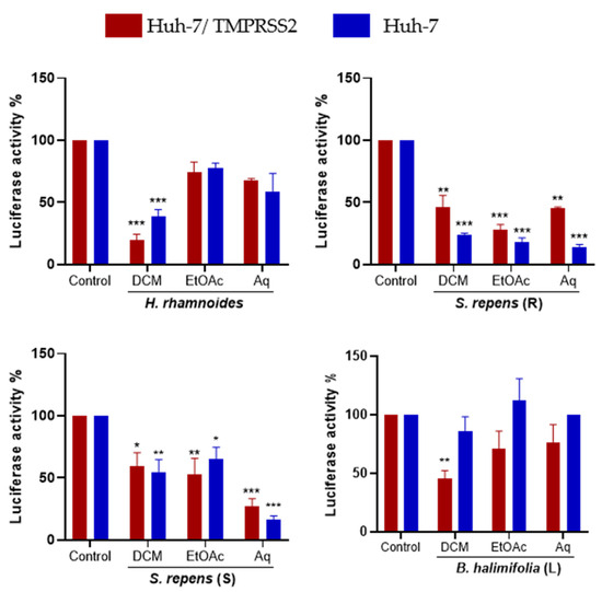 Following the identification of the toxicity, we studied the antiviral activity of the extract on HCoV-229E infection. A coronavirus enters the cells through one of two pathways: by endocytosis or by direct fusion with the plasma membrane. The host-cell protease transmembrane serine protease 2 (TMPRSS2) is necessary for the plasma membrane fusion of many coronaviruses, including HCoV-229E, whereas cathepsins are often involved in fusion processes at endosomal membranes [18]. We screened the antiviral activity of the crude methanolic extracts at a concentration of 25 µg/mL by quantifying the infection of HCoV-229E-Luc in Huh-7 cells, whether they expressed the TMPRSS2 protease or not. A significant decrease in the luciferase activity representing an antiviral effect was observed using Hippophae rhamnoides, Salix repens (R), Salix repens (S), Berberis aquifolium (R), and Baccharis halimifolia (L) in Huh-7/TMPRSS2 cells. Similarly, an antiviral effect was observed with Hippophae rhamnoides, Salix repens (R), Salix repens (S), Berberis aquifolium (R), and Baccharis halimifolia (L) in Huh-7 cells (Figure 3). Since Berberis aquifolium (R) crude methanolic extracts showed cytotoxicity at 100 µg/mL, we decided not to study it further.