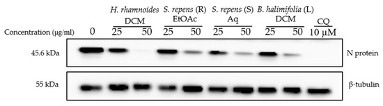Antiviral activity on SARS-CoV-2 of sub-extracts. Vero-81 cells were infected with SARS-CoV-2 in the presence and absence of different plant sub-extracts at 25 and 50 µg/mL, or 10 µM chloroquine. Cell lysates were collected after 16 h and subjected to immunoblotting as described. This blot is representative of two independent experiments.