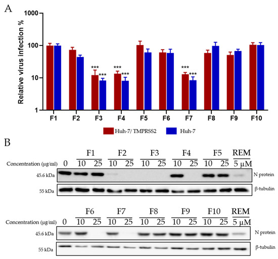 Antiviral activity of Hippophae rhamnoides fractions. (A) Screening of the antiviral activity of the fractions of Hippophae rhamnoides with HCoV-229E-Luc. The different fractions were tested at 25 μg/mL. (B) Western blotting analysis showing the effects of the different fractions of Hippophae rhamnoides on N protein expression in Vero-81 cells. Vero-81 cells were infected with SARS-CoV-2 in the presence of the different fractions at 10 and 25 µg/mL. Cell lysates were collected after 16 h and subjected to Western blotting. (***, p < 0.001).