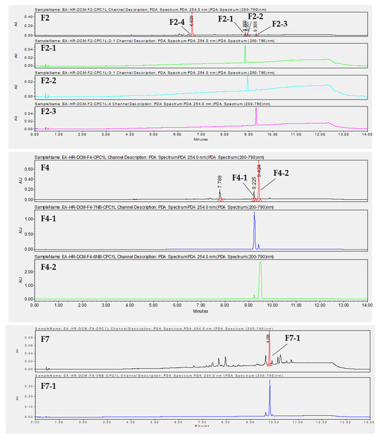 Chromatograms at λ = 254 nm obtained by UHPLC-UV-MS of F2, F4, and F7, as well as purified compounds obtained by preparative HPLC.
