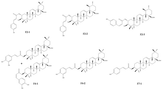 Taken together, F2-1, F2-2, F3-2, F4-1, F4-2, and F7-1 were identified as six cinnamoyl triterpenoids. Their purities were, respectively, estimated at 98.8, 88.6, 97.1, 90.7, 96.4, and 91.7% on the basis of PDA chromatograms (Figure S10). Their structures were established through a comparison of their physical and spectral data, including HRMS and extensive 1D- and 2D-NMR data, with reported values of 2-O-trans-p-coumaroyl-maslinic acid (F2-1) [20], 3β-hydroxy-2α-trans-p-coumaryloxy-urs-12-en-28-oic acid (F2-2) [21], 3β-hydroxy-2α-cis-p-coumaryloxy-urs-12-en-28-oic acid (F2-3) [21], 3-O-cis-caffeoyl-oleanolic acid (F4-1), 3-O-trans-caffeoyl-oleanolic acid (F4-2) [22], and 3-O-trans-p-coumaroyl-oleanolic acid (F7-1) [23] (Figure 9 and Figure S11). Unfortunately, F2-4 could not be precisely identified due to the lack of a mass response and poor NMR resolution. It was not a triterpenoid and seemed to be a flavonoid due to a positive response to Neu’s reagent.