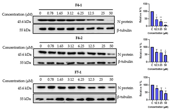 Antiviral activity of cinnamoyl oleanolic acids against SARS-CoV-2. The antiviral effect of F4-1 (3-O-cis-caffeoyl-oleanolic acid), F4-2 (3-O-trans-caffeoyl-oleanolic), and F7-1 (3-O-trans-p-coumaroyl-oleanolic acid) against SARS-CoV-2 was determined by Western blot. Vero-81 cells were treated with the different compounds at different concentrations for 16 h. Cell lysates were collected after 16 h and subjected to Western blotting. Data values represent the mean ± standard deviation from 3 independent experiments, (*, p < 0.05; **, p < 0.01; ***, p < 0.001).