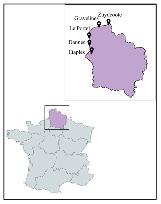 Plant species, mainly halophytes, were selected and collected between July 2020 and November 2020 from five different locations (Étaples, Dannes, Le Portel, Gravelines, Zuydcoote) distributed across the coastline region of northern France (Hauts-de-France region) in conjunction with the managers of the natural sites (Figure 11). Plants were mainly collected from schorres; coastal cliffs; and incipient, established, and relict dunes [46,47,48]. All these operations, followed by the identification of plant materials, were conducted by Prof. Céline Rivière and Dr. Gabriel Lefèvre from the Faculty of Pharmacy in Lille (UMRt BioEcoAgro). These samples were collected in accordance with the rules of the Nagoya Protocol and the French biodiversity law of 2017 (decision of 23 September 2020 issued by the Ministry of Ecological and Inclusive Transition; NOR: TREL2002508 S/342 and ABSCH-IRCC-FR-252501-1). Specific authorizations were also granted by the “Direction Interrégionale de la Mer Manche Est- Mer du Nord” (Decision n°778/2020) and by the prefect of the region of Normandy (regulation service for maritime activities). Harvested plant species were dried at 30 °C in an oven for a maximum of one week and protected from light. Different parts of these plants (leaves, stems, roots) were pulverized separately using a crushed Retsh Cutting Mill SM200.