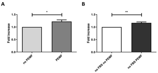 Effect of pulsed electromagnetic fields (PEMF) on skeletal muscle cells (SkMC) proliferation determined by BrdU assay. Muscle cells were treated in magnetic field for 4 h on two consecutive days with or without serum-free culture medium (PEMF—no FBS PEMF). SkMC exposed to PEMF exhibited significantly increased proliferation compared to the control cells under both complete medium conditions (A) and serum-free conditions (B). The data were normalized to the proliferation of the control cells (no PEMF; no FBS and no PEMF). Data are presented as the mean ± SEM from three independent experiments (* p < 0.05, ** p < 0.01).