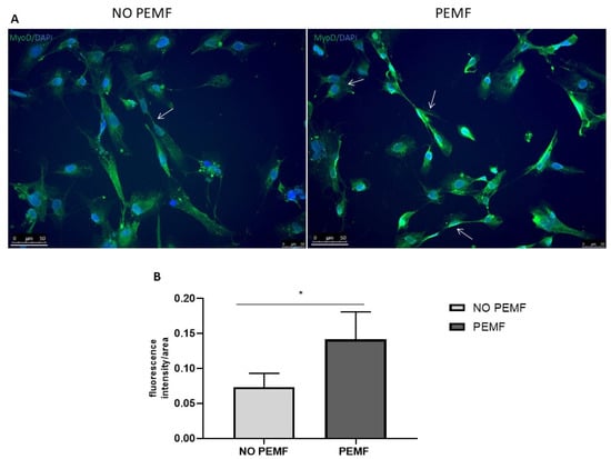 Effect of pulsed electromagnetic fields (PEMF) on MyoD expression in human skeletal muscle cells (SkMC) by immunofluorescence staining. Exposure to PEMF increases MyoD levels. (A) Representative immunofluorescence microscopy images of MyoD. Cell nuclei were stained using DAPI. White arrows indicate SkMC fusing to form multi-nucleated myotubes. Scale bars represent 50 µm. (B) Quantification of MyoD fluorescence intensity compared to control cells. The intensity was normalized to the immunofluorescence area. Data are presented as the mean ± SEM. The significance of the results was tested using a Student’s t-test between groups with a minimum of 6 images (* p < 0.05).