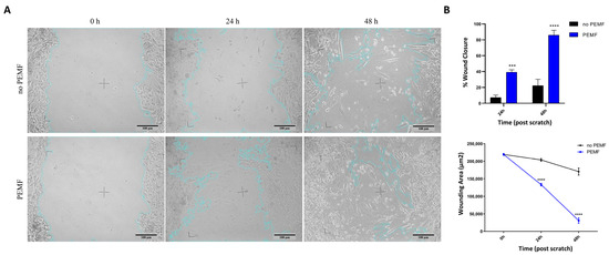 To investigate the PEMF capacity to improve SkMC regeneration following damage, wound healing assays were performed. The results showed that the cell repair ability significantly increased after cell stimulation with pulsed electromagnetic fields for 4 h a day for two consecutive days. In fact, the wound area was reduced by approximately 32% (p < 0.001) and 64% (p < 0.0001) 24 and 48 h after the scratch, respectively, in comparison with PEMF-unexposed controls (Figure 5). These results suggest that PEMF increase the mobility of human skeletal muscle cells, increasing their regenerative capacity following physical damage.