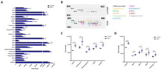 To assess whether exposure to PEMF caused a change in the proteomic profile of cellular stress proteins, we analyzed 26 cell-stress-related proteins. Protein extracts of SkMC treated or untreated with PEMF for 4 h for two consecutive days were analyzed on a proteome array. We identified 10 proteins involved in the response to oxidative stress and the modulation of cell proliferation and apoptosis, which were significantly overexpressed in PEMF-treated cells compared to the controls (Figure 6A,B). In particular, we could distinguish five proteins expressed at a lower level, Phospho-JNK Pan (30% increase over controls), Paraoxonase 2 (PON2) (+18% vs. controls), Sirtuin 2 (SIRT2) (+17% vs. controls), superoxide dismutase 2 (SOD2) (+22 vs. controls), thioredoxin-1 (+28% vs. controls) (Figure 6C), and five proteins expressed at a higher expression level, heat shock protein 70 (HSP70) (+25% vs. controls), hypoxia-inducible transcription factor 2a (HIF-2a) (+40% vs. controls), Cytochrome c (+39% vs. controls), Paraoxonase 3 (PON3) (+19% vs. controls), and p21/CIP1 (+27% vs. controls) (Figure 6D).