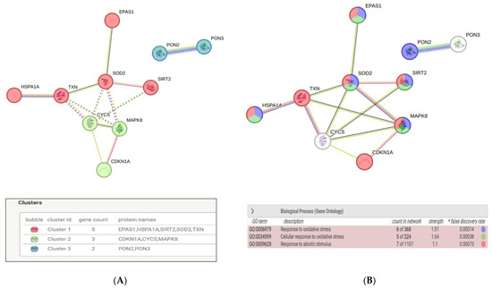Clustering functional analysis of the 10 proteins modulated by PEMF in SkMC. (A) Modulated proteins can form three principal clusters, highlighted with bubbles in red, green, and blue colors. Cluster 1 and 2 are highly interconnected with each other by physical binding or functional interactions. The legend shows the proteins belonging to the same cluster. (B) Gene ontology functional enrichment analysis shows that the modulated proteins were enriched in “response to oxidative stress” (proteins denoted with blue color), “cellular response to oxidative stress” (proteins denoted with green color), and “response to abiotic stimulus biological processes” (proteins denoted with red color). The legend shows the significant biological processes enriched by proteins and the corresponding false discovery rate. HSPA1A is HSP70, EPAS1 is HIF-2-Alpha, CDKN1A is p21, and MAPK8 is JNK (aliases).