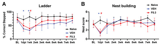 - Metz, G.A.; Whishaw, I.Q. The Ladder Rung Walking Task: A Scoring System and its Practical Application. J. Vis. Exp. 2009, 28, 1204. [Google Scholar] [CrossRef]