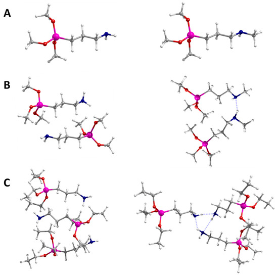 Figure 1A,B, show the DFT-optimized structures for APTS and MAPTS monomers and two illustrative structures of dimers. For each system (APTS and MAPTS), two dimer structures were optimized: head-to-head (labeled HH) and head-to-tail (labeled HT). Figure 1C, presents the optimized structures of HT and HH trimers of APTES. Similar HT and HH structures were obtained for APTS and MAPTS. The energies of the optimized structures shown in Table S1, Supplementary Materials.