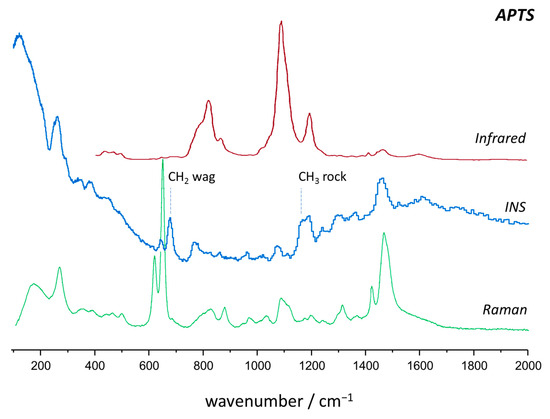 Due to the absence of symmetry-related selection rules mentioned above, INS has the advantage of being able to observe all vibrational modes of a system (although they can be either weak or fall in an overcrowded region, thus preventing their clear observation in the experimental spectrum). As can be seen in Figure 2, there are at least two modes of APTS, inactive or weak, in the optical techniques that are readily observable with neutron spectroscopy (components of the deformation modes CH2 wag and CH3 rock). Thus, the full assignment of the vibrational modes of any system must profit from this complementarity of spectral information.