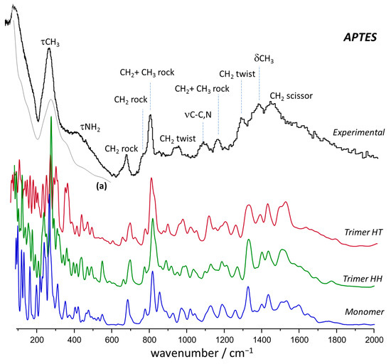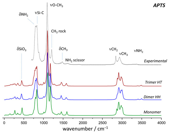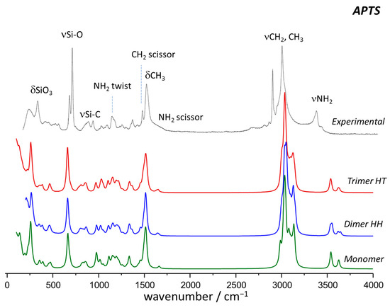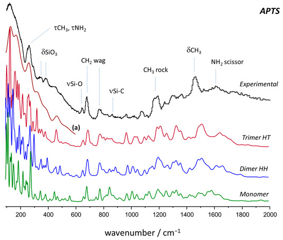 However, the most relevant issue concerning these calculated spectra is that they are nearly insensitive to the size of the cluster used in the calculation. In other words, the intensity changes observed in the calculated spectra with increasing cluster size—i.e., from monomer to dimers and trimers—are generally small and do not allow a clear identification of the best model, as was observed for INS spectra. A similar situation arises for the infrared and Raman spectra of MAPS and APTES, as shown in the Supplementary Materials (Figures S2–S5).
