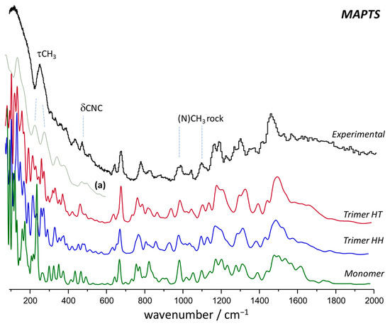 The best prediction of the experimental INS spectrum of MAPTS is also obtained from a trimer model. As shown in Figure 4, both trimer forms offer a reasonable simulated spectrum. The presence of the additional methyl group is observed in the intensity profile at ca. 980 cm−1 and 1090 cm−1 (N–CH3 rocking modes) and from the individual band at ca. 475 cm−1, related to the C–N–CH3 skeletal bending mode. The calculated spectra display a split of the CH3 torsional modes, assigned to “free” and “H-bonded” CH3 rotors, which is not clearly observed in the experimental spectrum (Figure 4).
