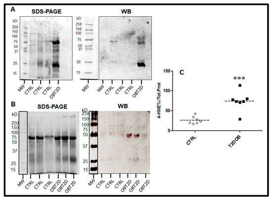 Panel (A,B): Representative blots of 4-HNE–protein adducts in adipose tissue of six control subjects (CTRL) and four obese patients with type 2 diabetes (OBT2D). MW: molecular weight; kD: kilodalton. SDS-PAGE: Sodium dodecyl-sulfate polyacrylamide gel electrophoresis; WB: Western Blot. Panel (C): Dot plot graph showing the relative optical density of 4-HNE–protein adducts expressed as percentage of total protein in AT of CTRL subjects (grey circles) and OBT2D patients (dark squares). Dotted lines represent the mean values in each group (*** p < 0.001 vs. CTRL).