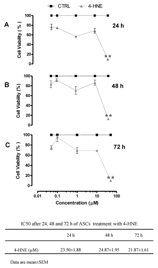 ASC isolation was performed as previously reported [17,49]. Since lipid peroxidation products are more “toxic” when cells are exponentially grown [50], the experiments for assessing cell viability were carried out on resting, “synchronized” ASCs. In detail, before treatment, cell cultures were starved through 48 h of incubation in a washout DMEM-F12 medium containing 0.5% FBS and antibiotics. The cells were left “untreated” (control) or incubated with 4-HNE (JAICA, Japan Institute for the Control of Aging, Nikken SEIL Co., Ltd., Fukuroi, Shizuoka, Japan) at concentrations between 0.05 and 50 μM for 24, 48, and 72 h, respectively. For the cell treatment, 4-HNE was dissolved in ethanol, and the final concentration of ethanol in the culture medium did not exceed 0.1% (v/v). Equivalent quantities of ethanol were also added to the control cells.