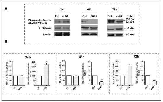 Recruitment of WNT signaling in human ASCs isolated from CTRL subjects (n = 4) treated with 4-HNE. The effect on cellular β-catenin and its phosphorylation (phospho-β-catenin) was investigated after challenging the cells with 4-HNE (1 µM) and immunoblots obtained after 24, 48, and 72 h of incubation (panel (A)). Data are expressed as the protein percentage in the cell treatment relative to control tests (CTRL), which were considered as 100%, and represent mean ± SEM of at least three different experiments (sample assayed three times for each experiment) (panel (B)). β-Actin was used as the loading control. IOD: integrated optical density; *** p < 0.05 vs. CTRL.