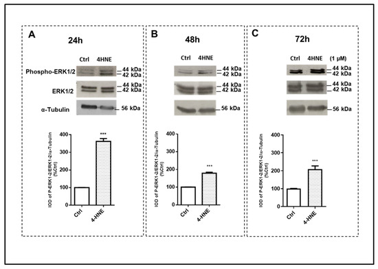 Immunoblot analysis of extracellular-signal-regulated kinases (ERK 1/2) and its phosphorylation (phospho-ERK1/2) after 24 h (panel (A)), 48 h (panel (B)), and 72 h (panel (C)) of treatment with 4-HNE (1 μM) in human ASCs isolated from CTRL subjects (n = 4). Data were calculated based on the ratio of the integrated optical density (IOD) of the phosphorylated protein to that of total protein and that of the housekeeping protein (α-Tubulin). Results are expressed as the percentage of the cell treatments relative to the control tests (CTRL) that were considered as 100% and represent the mean ± SEM of at least three different experiments (sample assayed three times for each experiment). α-Tubulin was used as the loading control. *** p < 0.001 vs. CTRL.