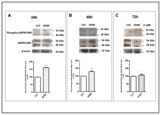 Immunoblot analysis of stress-activated protein kinases/c-Jun N-terminal kinases (SAPK/JNK) and their phosphorylation (phospho-SAPK/JNK) after 24 h (panel (A)), 48 h (panel (B)), and 72 h (panel (C)) of treatment with 4-HNE (1 μM) in human ASCs isolated from CTRL subjects (n = 4). Data were calculated based on the ratio of the integrated optical density (IOD) of the phosphorylated protein to that of total protein and that of the housekeeping protein (β-actin). Results are expressed as the percentage of the cell treatments relative to the control tests (CTRL), which were considered as 100%, and represent mean ± SEM of at least three different experiments (sample assayed three times for each experiment). *** p < 0.001 vs. CTRL. * p < 0.05 vs. CTRL.