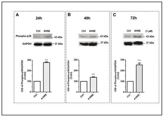 Immunoblot analysis of p38 MAPK and its phosphorylation (phospho-p38) after 24 h (panel (A)), 48 h (panel (B)), and 72 h (panel (C)) of treatment with 4-HNE (1 μM) in human ASCs isolated from CTRL subjects (n= 4). Data were calculated based on the ratio of the integrated optical density (IOD) of the phosphorylated protein to that of the housekeeping protein (Glyceraldehyde 3-phosphate dehydrogenase, GAPDH). Results are expressed as the percentage of the cell treatments relative to the control tests (Ctrl), which were considered as 100%, and represent the mean ± SEM of at least three different experiments (sample assayed three times for each experiment). *** p < 0.05 vs. CTRL.