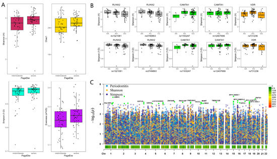 (A) Box and jitter plots of alpha diversity indices of the subgingival microbiota of mild–moderate and severe periodontitis MetS patients (no significant differences detected). (B) Box and jitter plot of alpha diversity indices that showed associations with SNPs within RUNX2, CAMTA and the VDR genes. (C) A Manhattan plot to compare associations between the subgingival microbiota alpha diversity measures and periodontitis severity after correcting for age, sex, smoking frequency, BMI and population structure. Suggestive associations highlighted in green.