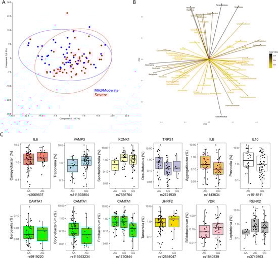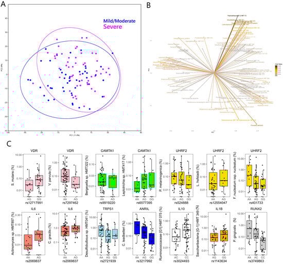 (A) Score plot of the first 2 principal components of CLR-transformed 16S microbial species abundance data from the MetS periodontitis patients. (B) Loading plot from the principal components analysis showing microbial variables that most strongly influenced the first 2 principal components in plot A. (C) Box and jitter plots of SNP variants from the selected gene panel that showed significant associations with relative abundance of different microbial species in the subgingival plaque. Please note that each SNP was filtered for all alleles present at 10% MAF for the analysis, so for SNPs below this threshold, the model was run for only two of the genotypes.