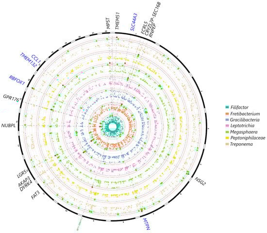 From the selected gene SNP panel, IL6 was associated with Campylobacter, KCNK1 was associated with Saccharibacteria, VAMP3 was associated with Treponema, and several variants within CAMTA1 were associated with Bergeyella, Fretibacterium, Actinomyces and Corynebacterium at p < 0.001 (Figure 2). Associations were also observed with IL1B and Aggregatibacter, TRPS1 (Desulfobulbus), IL10 (Prevotella), UHRF2 (Tannerella), VDR (Bifidobacterium) and RUNX2 (Leptotrichia) at p < 0.005 (Figure 2). In the genome-wide analysis, genera such as Filifactor, Gracilibacteria, Fretibacterium, Leptotrichia, Megasphaera and Treponema showed associations with several loci at p < 10−5; however, no significant associations could be detected at p < 10−7. The gene–genus pairs that showed associations at p < 10−5 included NUBPL (Filifactor), FAT3 (Gracilibacteria), CAMTA1 and AKAP3 (Fretibacterium), FCRL5 (Leptotrichia), MPST, GPR176 (Megasphaera), SEC16B (Peptoniphilaceae) and TMEM51 (Treponema) (Figure 3).