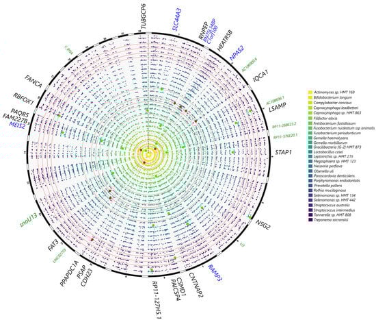 Circular Manhattan plot showing subgingival microbial species in the MetS patients that showed the strongest signals with genetic markers in the genome-wide analysis after correcting for age, sex, smoking frequency, BMI and population structure. Variants at p < 10−4 for at least one trait are plotted with signals at p < 10−6 highlighted in red and suggestive associations at p < 10−5 highlighted in green. Highlighted markers are annotated in the outer circle: SNPs within gene-coding regions are in black, genes adjacent to exon SNPs are in blue, and non-coding RNAs and other regulatory elements are annotated in green.