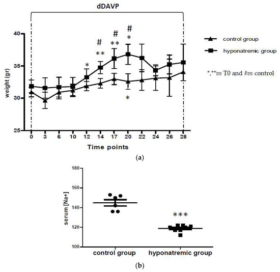Body weight and serum [Na+]. (a) Body weight fluctuations in the two experimental groups. Results are expressed as mean ± SE. * p ≤ 0.05, ** p ≤ 0.02 vs. T0 and # p ≤ 0.05 vs. control group. (b) Serum [Na+] (mEq/L) in control group and hyponatremic group. Results are expressed as mean ± SE. *** p ≤ 0.002 vs. control group.