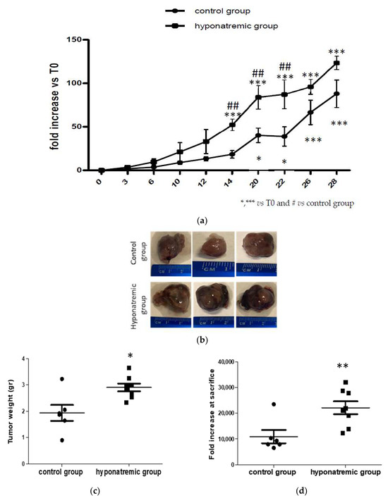 Analysis of tumor growth. (a) Tumor masses in control and hyponatremic groups were measured at different time points. Results are expressed as mean ± SE. * p ≤ 0.05, *** p ≤ 0.002 vs. T0 and ## p ≤ 0.05 vs. control group. (b) Representative examples, (c) weight (gr) and (d) volume (mm3) of explanted tumor masses. Results are expressed as mean ± SE. * p ≤ 0.05, ** p ≤ 0.02 vs. control group.