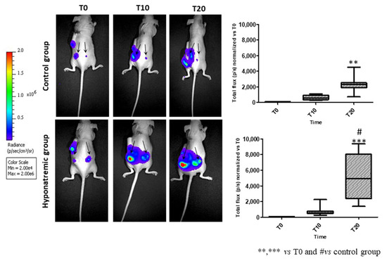 Tumor activity was assessed in vivo with the IVIS Lumina S5 System at different time points: T0, T10 and T20. At T20, the bioluminescence emission was significantly increased both in the control and in the hyponatremic group, when compared to T0 (p ≤ 0.02 and p ≤ 0.002 vs. T0). More interestingly, at T20 the bioluminescent emission of tumor masses in the hyponatremic group was significantly greater than in the control one (p ≤ 0.05) (Figure 4).