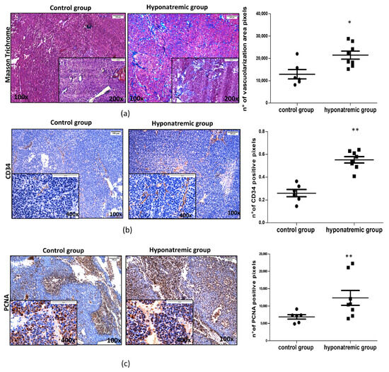 Thus, CD34 has been also utilized as a biomarker to assess angiogenesis in malignancies [22] and an increased number of CD34 surface-expressing cells has been correlated with disease progression and therapy resistance in neuroblastoma [23]. Noteworthy, the immunostaining for CD34 was more intense in the vessels of tumor lesions from hyponatremic mice, with a statistically significant difference. In addition, we found a significantly higher expression of the PCNA in this group of animals. PCNA is a nuclear protein, which is involved in DNA replication, elongation and repair [24]. PCNA also regulates cell cycle progression through the G1/S boundary by interacting with cyclin/cdk, and it has been identified as a possible target for anticancer strategies [24,25,26,27,28].