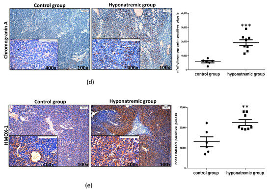 Paraffine embedded tumor masses were histologically and immunohistochemically analyzed. Masson’s Trichrome staining showed that in hyponatremic mice tumors were more vascularized than in normonatremic animals (p ≤ 0.05 vs. control group) (Figure 5a). This finding was confirmed by immunohistochemical analysis for CD34, a marker of endothelial progenitor cells, which was found to be more intensively expressed in the tumor masses of hyponatremic mice (p ≤ 0.02 vs. control group) (Figure 5b). The levels of expression of the proliferating cell nuclear antigen (PCNA) were also significantly greater in the tumor masses of hyponatremic mice compared to normonatremic mice (p ≤ 0.02 vs. control group) (Figure 5c). Chromogranin A, a protein widely expressed in neuroblastomas that has a strong correlation with cell proliferation, showed a significantly stronger expression in tumors from hyponatremic mice (p ≤ 0.002 vs. control group) (Figure 5d). The expression of the oxidative marker protein HMOX-1 was also analyzed. Again, HMOX-1 was more intensively expressed in the masses of hyponatremic mice (p ≤ 0.02 vs. control group) (Figure 5e).